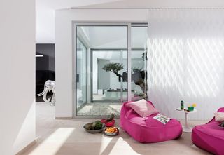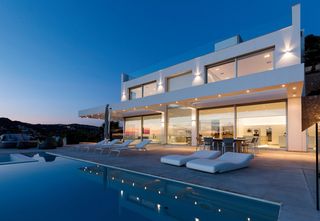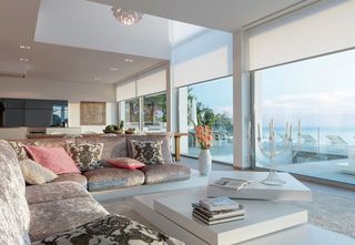 Diese moderne Villa mit 600 m2 Wohnfläche auf drei Etagen bietet einen herrlichen Blick auf Mallorcas schöne Küste. Silent Gliss stattete das Anwesen mit weissen motorisierten Vertical Waves am Eingang und im Atrium aus. Die motorisierten Rollos SG 4870 wurden in allen Räumen installiert. Ein motorisierte Rollo SG 4880 mit einer beeindruckenden Fallhöhe von 6.5 m über zwei Etagen wurde zusätzlich im Wohnzimmer installiert. Die Rollos bieten ein einheitlichen Bild mit der Aussenfassade.