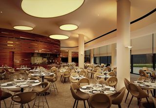 Aufgrund der Größe der Fenster wurden für den Einsatz im Hotelrestaurant und in der Lobby zwölf motorisierte Silent Gliss Rollo-Systeme ausgewählt. Die Kombination aus einem Screen aus der Silent Gliss Kollektion und einer Fernbedienung sorgt für eine perfekte Steuerung des Lichts über die gesamte Glasfassade des Restaurants.