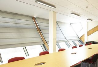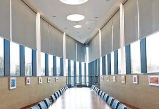 Der «Haifisch-Flossen»-Sitzungssaal wurde mit 16 Rollo-Systemen ausgestattet, weitere 8 gekoppelte und 8 Einzel-Systeme wurden in Korridoren und Hintereingang verbaut. Zusätzlich dazu erhielten der runde Kantinenbereich Rollo-Systeme und die Tagungsräume Kassettenrollos. Insgesamt kamen 85 elektrisch betriebene Systeme zum Einsatz, alle können per Funk gesteuert werden.